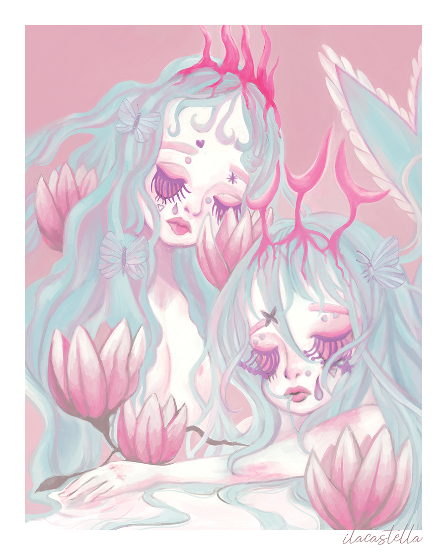 Mix Media, glittered ink +Â digital painting. Gallery work for The Fantasia Exhibition, 2019 at the Joshua Creek Heritage Art Centre (Oakville, ON).Â